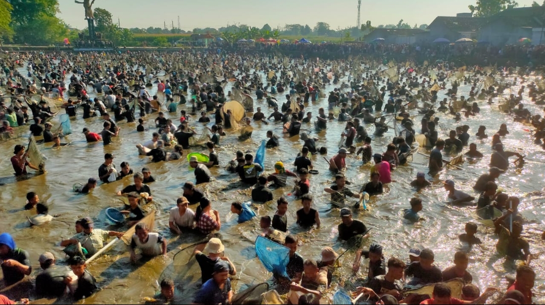 Begitu aba-aba diberikan, mereka berebut masuk ke sendang yang sudah disiapkan sebelumnya untuk menangkap ikan yang berenang bebas.