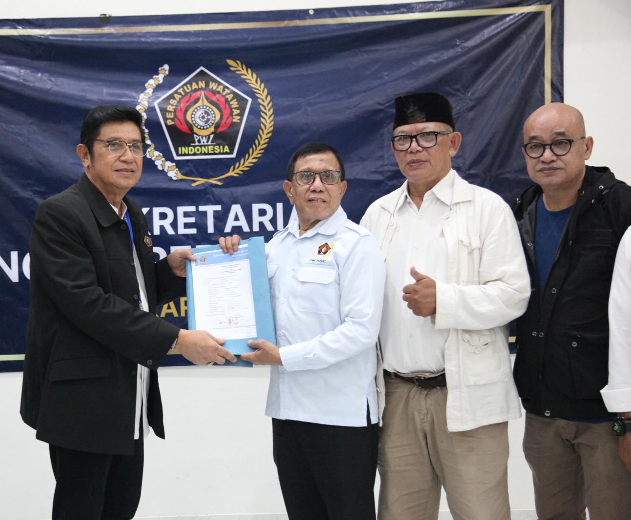 HCB, panggilan akrab Hendry Ch Bangun menyerahkan surat persyaratan pendaftaran yang diterima langsung oleh Ketua Steering Comitte (SC) Panitia Kongres Persatuan PWI 2025, Zulkifli Gani Otto.