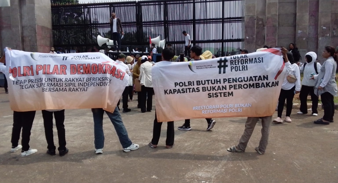 Tuntutan massa juga tercermin melalui spanduk-spanduk yang mereka bentangkan, yang berbunyi: “Polisi butuh restorasi bukan formasi,” “#tolak reformasi Polri, Polri butuh penguatan kapasitas bukan perombakan sistem,” dan “Restorasi Polri bukan reformasi Polri.”