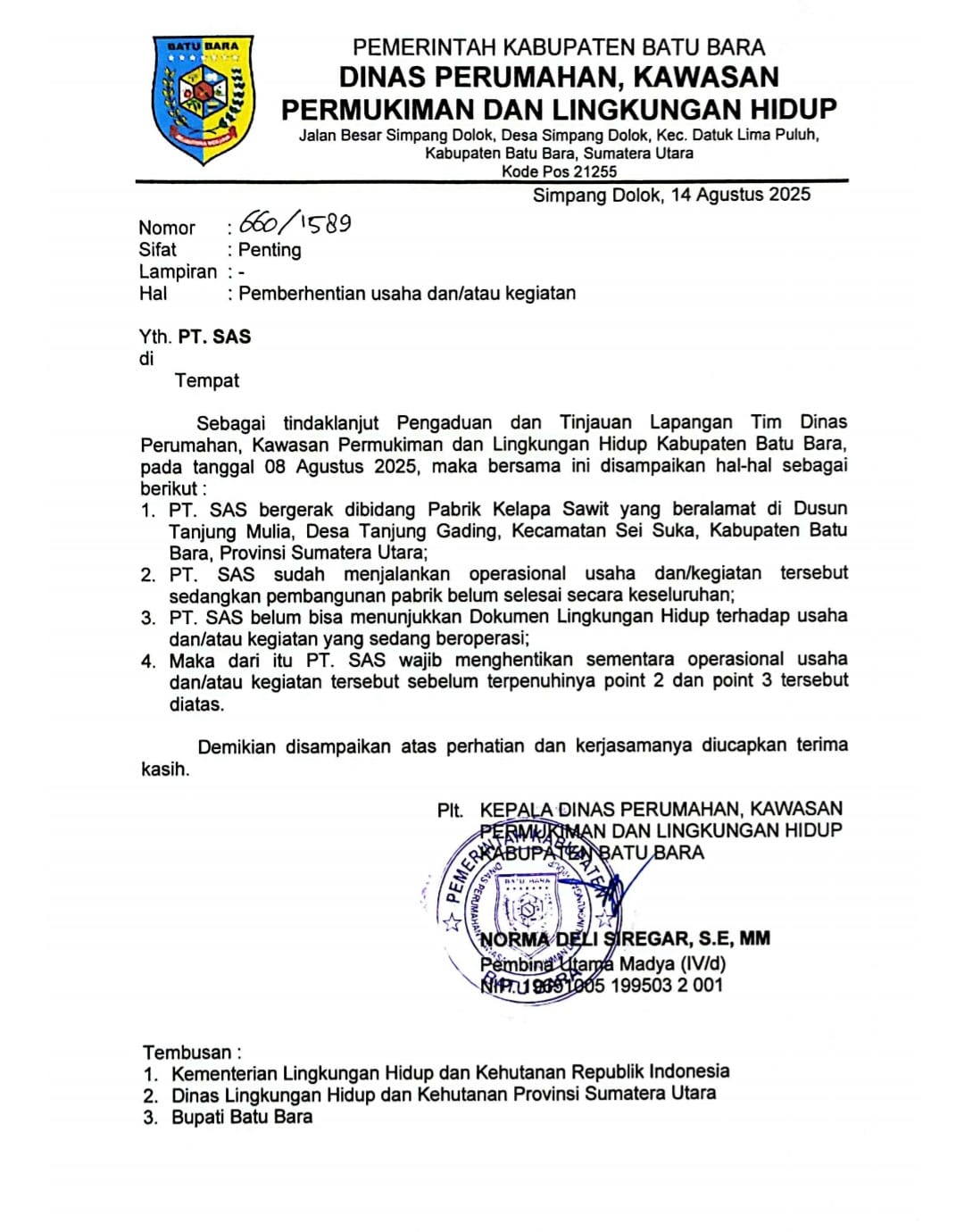 Berdasarkan surat yang dikeluarkan oleh Dinas Perkim dan Lingkungan Hidup Kabupaten Batubara tertanggal 14 Agustus 2025, Nomor 660/1589 perihal Pemberhentian Usaha dan/atau Kegiatan, ditegaskan bahwa PT SAS belum memiliki dokumen lingkungan hidup resmi karena IPAL masih dalam proses pembangunan. Namun faktanya, pabrik tetap beroperasi.