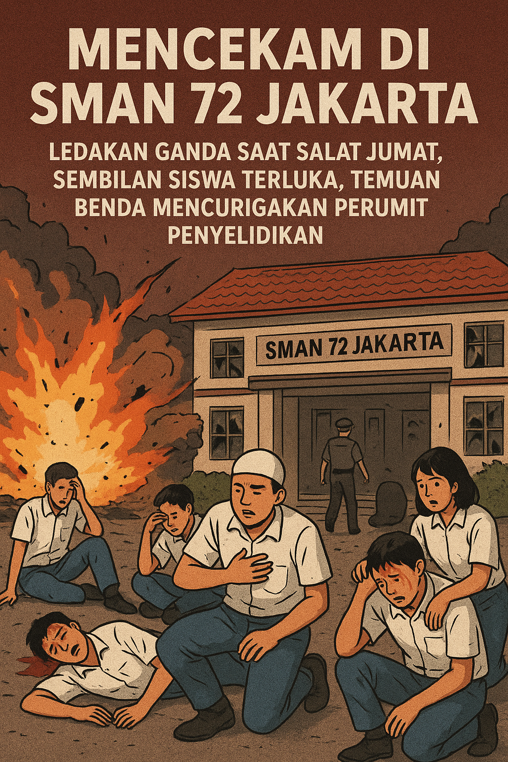 Jakarta, faktapers.id  – Suasana khidmat Salat Jumat di SMA Negeri 72 Jakarta, yang berlokasi di Jakarta Utara, mendadak berubah menjadi kepanikan setelah serangkaian ledakan terjadi di lingkungan sekolah. Insiden mencekam yang terjadi pada 7 November 2025 sekitar pukul 12.15 WIB ini menyebabkan sembilan siswa terluka dan memicu respons darurat dari aparat keamanan.