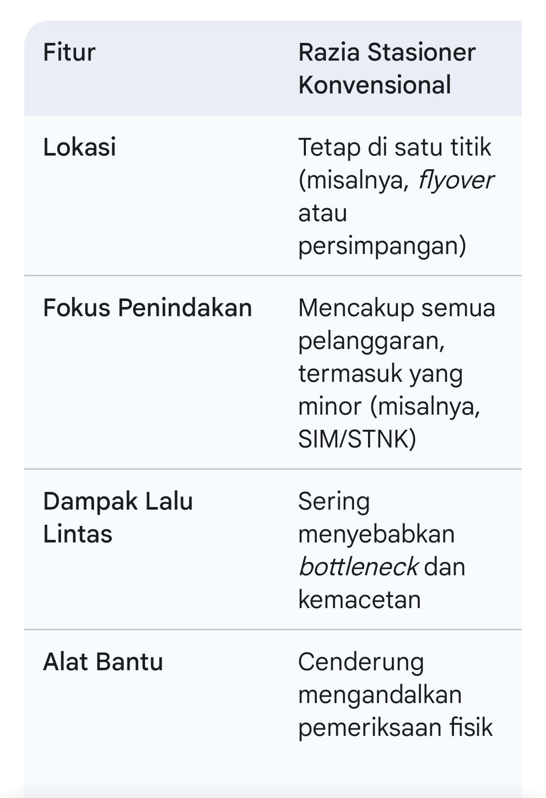 ​Keputusan untuk meninggalkan razia stasioner di pinggir jalan didasarkan pada evaluasi bahwa metode tersebut sering kali menyebabkan kemacetan parah dan rawan penyalahgunaan wewenang.