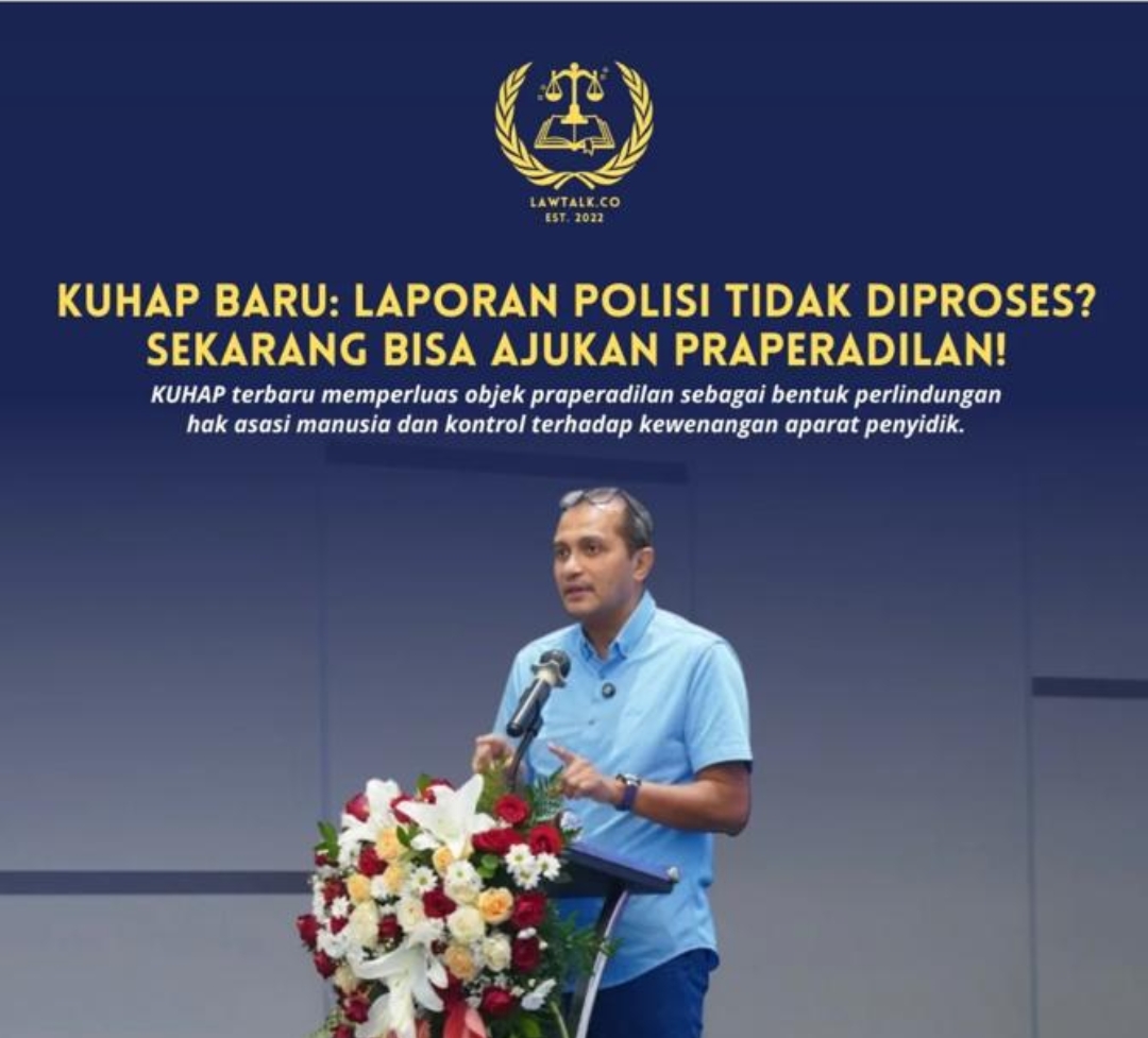 lawtalk.co menyatakan: “Jangan Diam! Dengan KUHAP terbaru, pembiaran laporan (undue delay) sekarang bisa diuji lewat praperadilan. Ini adalah langkah besar bagi perlindungan HAM dan pengawasan penyidik agar proses hukum tetap objektif dan transparan.”